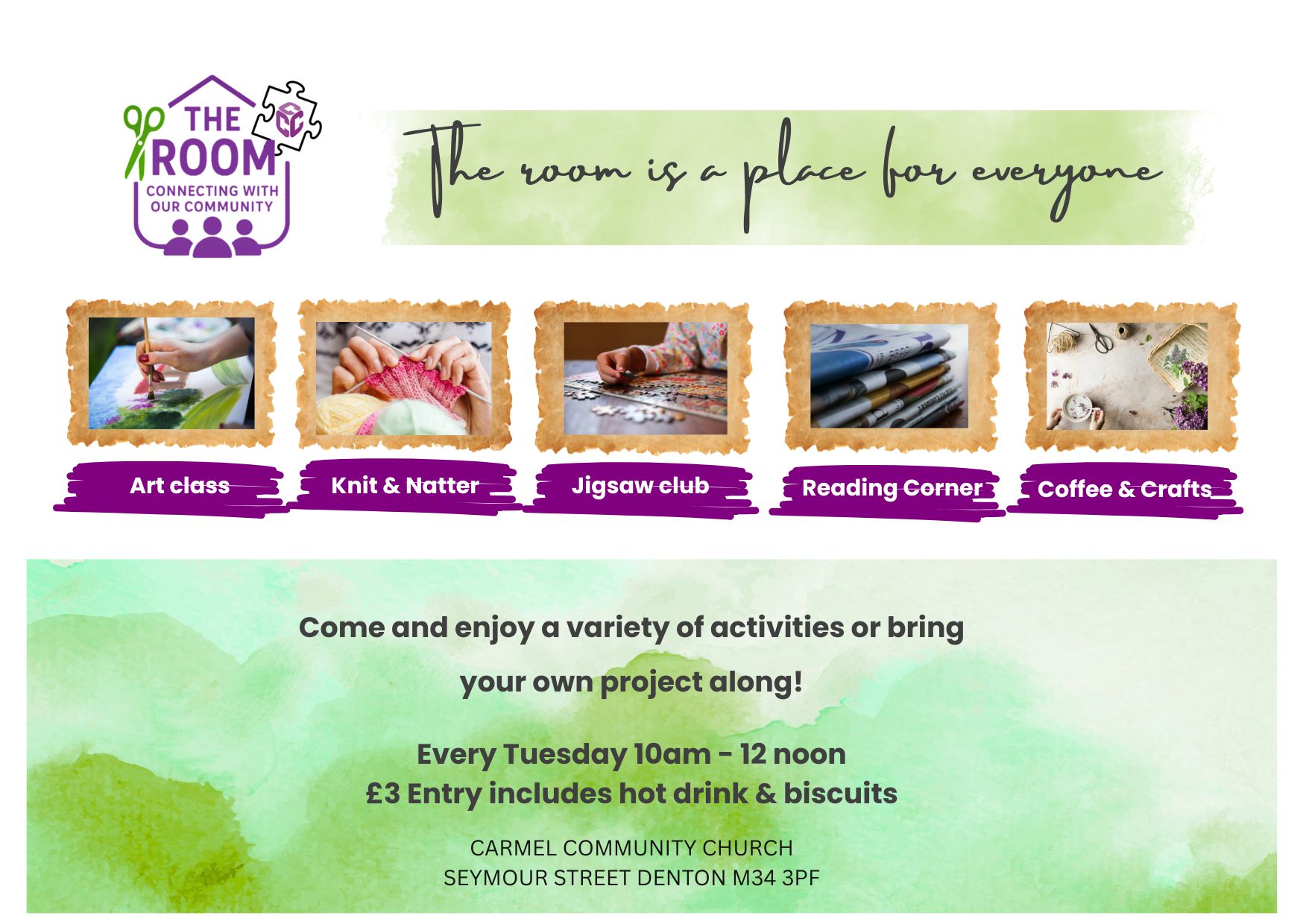 The Room is a community group, run by our team of volunteers who have a heart for community, crafting and so much more. There are a range of activities on offer including crafts, knitting and crocheting, art classes using a variety of mediums, a jigsaw corner and reading corner. Each session is £3 and includes hot drinks & biscuits and is a greta place to make new friends.